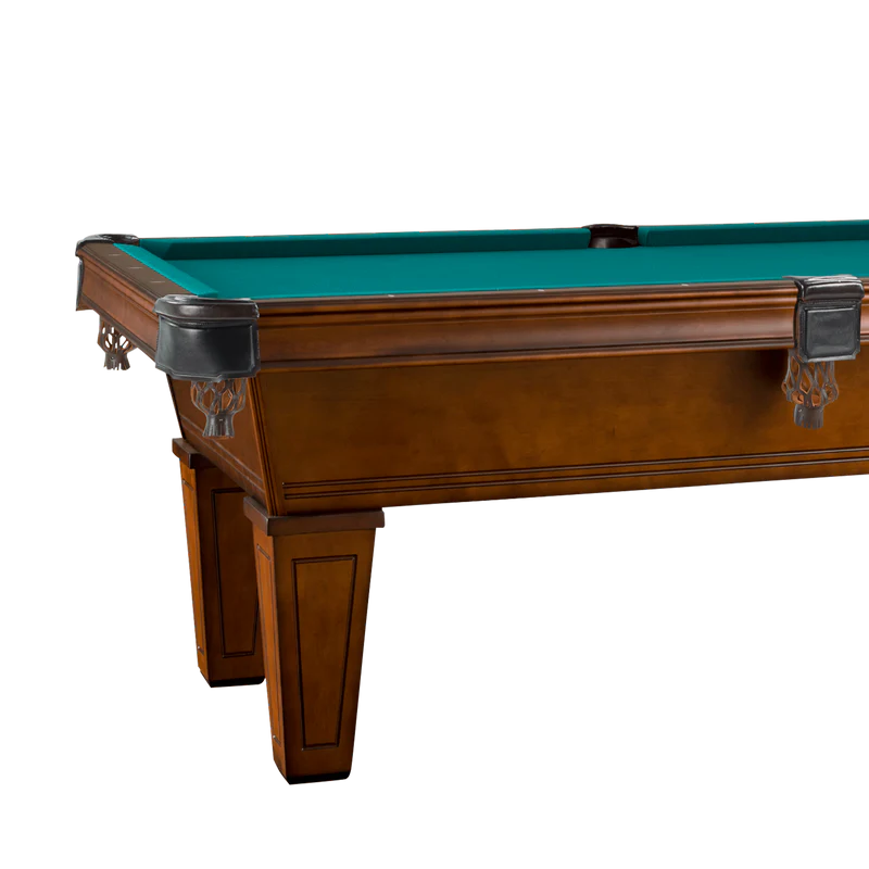 Meet the Avon Pool Table, where style meets functionality effortlessly. Its warm suede finish and brown leather pockets create an aura of sophistication, while the white molded pearlized diamond rail sights enhance its elegant appeal. Engineered with a 1″ three-piece certified slate and K66 premier cushion rubber, this table delivers consistent performance. External basket shield pockets provide convenient storage during gameplay, complementing the table’s sturdy tapered block-style legs and detailed cabinet.