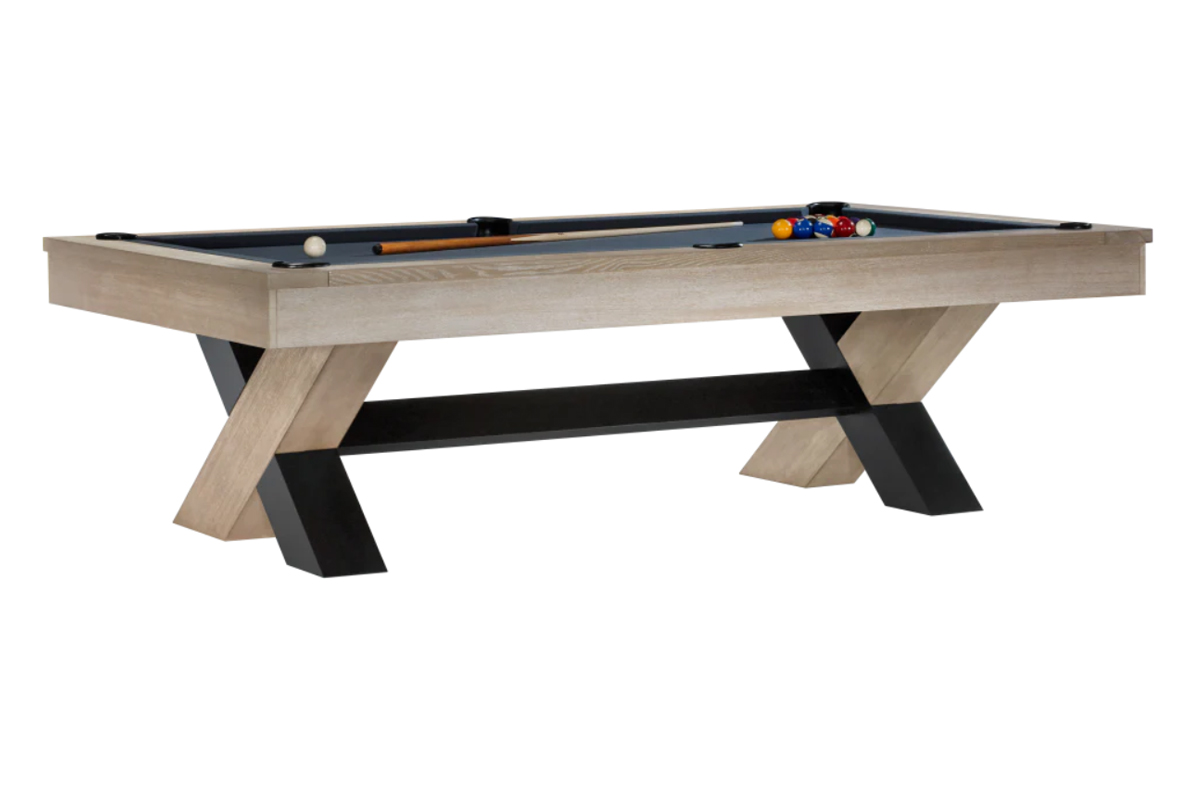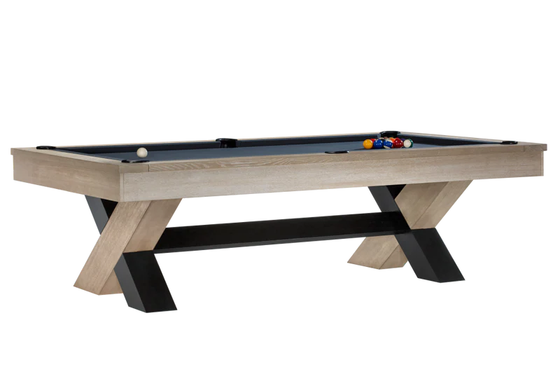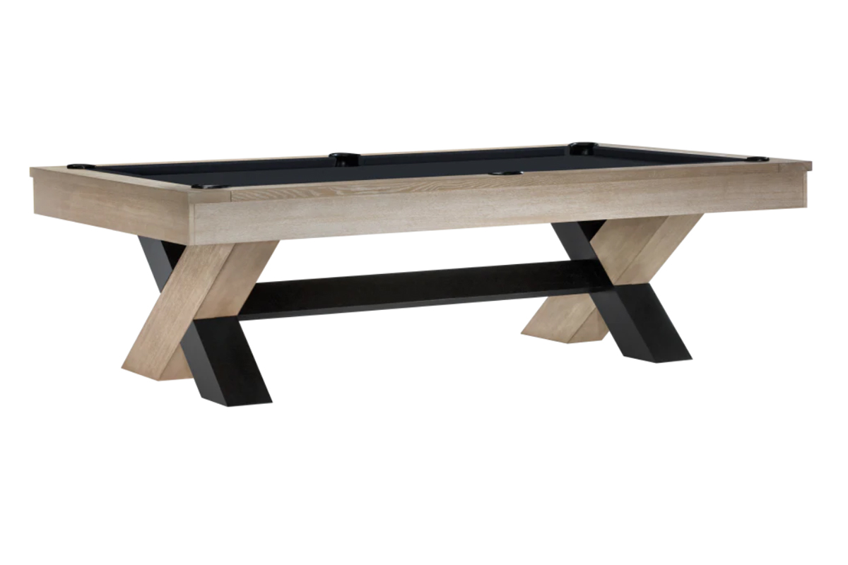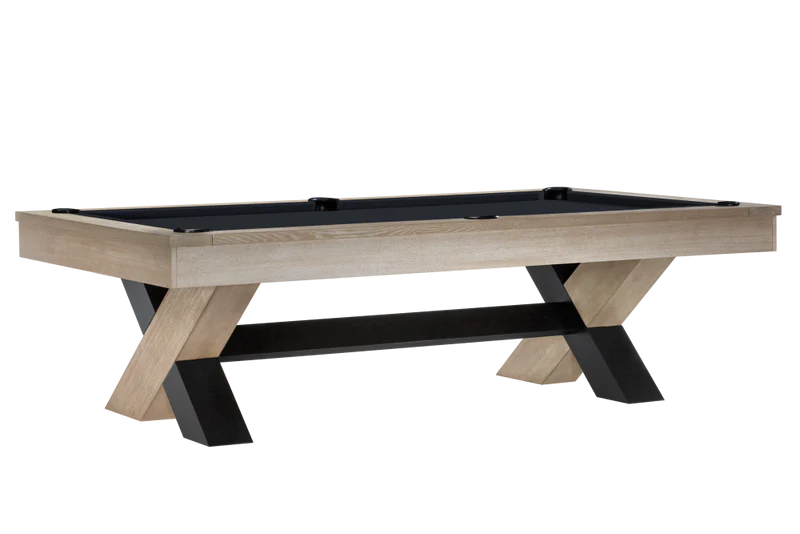 The Halifax is an urban-inspired design with a two-tone natural ash finish and sleek matte black metal construction. Its bold, sculptural silhouette features a contemporary X-leg base and is perfect for making a statement in any game room. White pearlized diamond rail sights, K66 premier cushion rubber, and internal drop pockets complete the pool table. Upgrade your experience with the Dining Conversion Top and a set of Dining Storage Benches (sold separately) for ultimate versatility.