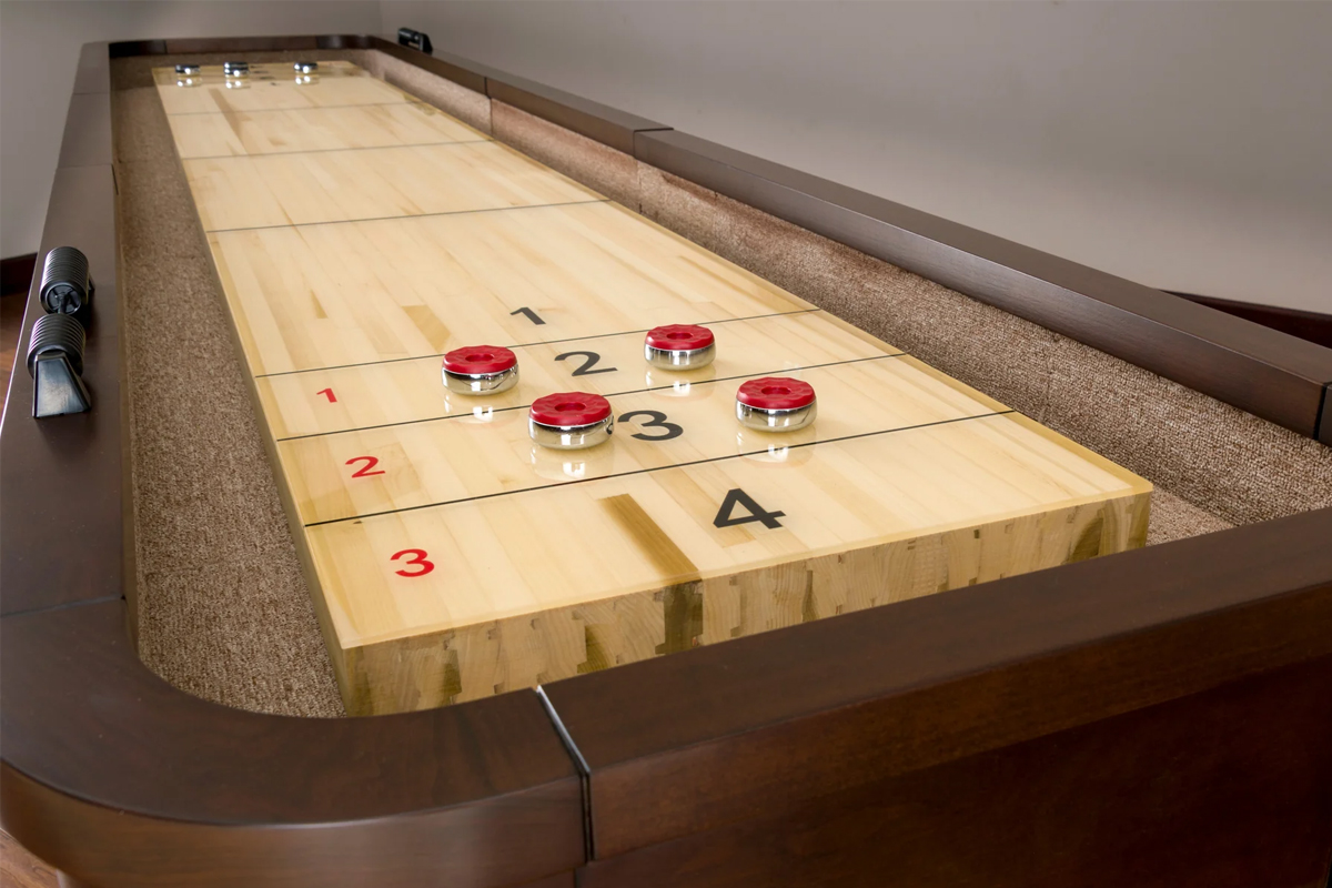 The Milan Shuffleboard table features a traditional, clean look, combined with unmatched construction principles to create a spectacular, high-end shuffleboard experience. By using a heavy-duty poplar playfield that is extra large at 20 inches wide by 2.5 inches high, we ensure fun family game play on a board that is meant to last. Polyurethane protects the beautiful poplar board from damage while a vertically staved Playfield ensures the boards stability through temperature change. The table’s undercarriage features climatic adjusters to help level the board properly under all circumstances.