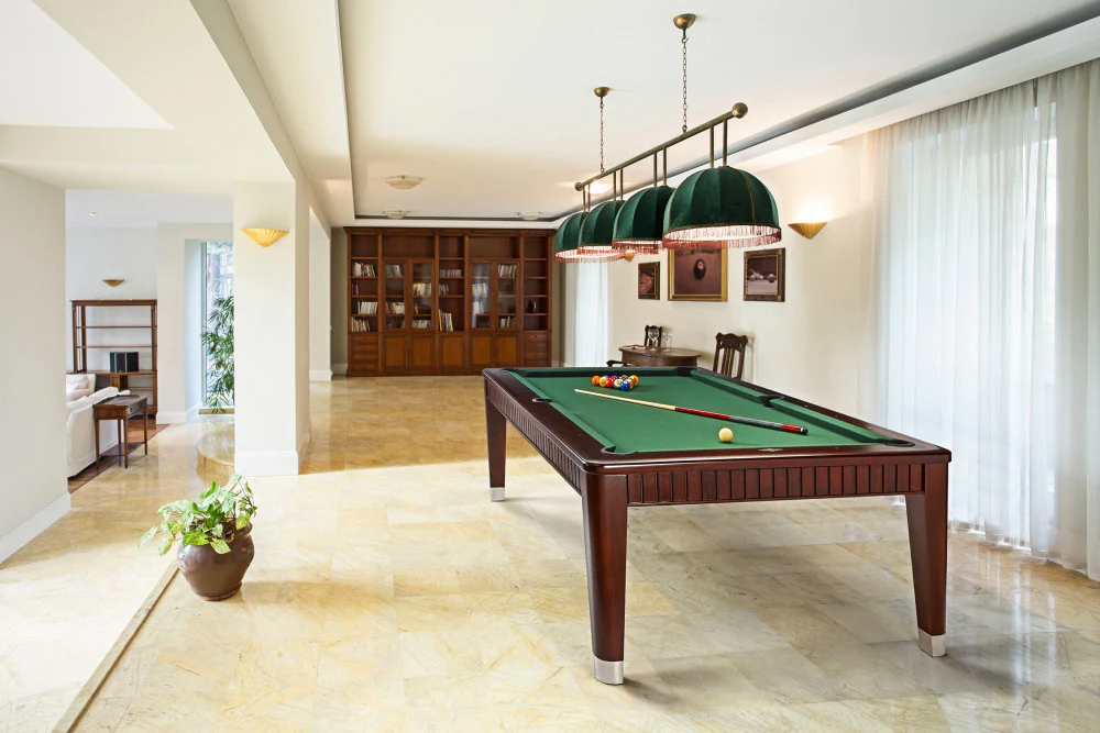 The Henderson offers the sleek look of a fine dining room table with the legendary playability of the Brunswick Billiards brand. A beautiful table in its own right, the Henderson offers the versatility to quickly change your game room to fit your needs. Simply use the optional dining top and transform your game room into a banquet room, a conference room, an arts & crafts room or leave it off and enjoy hours of play on this elegant model.