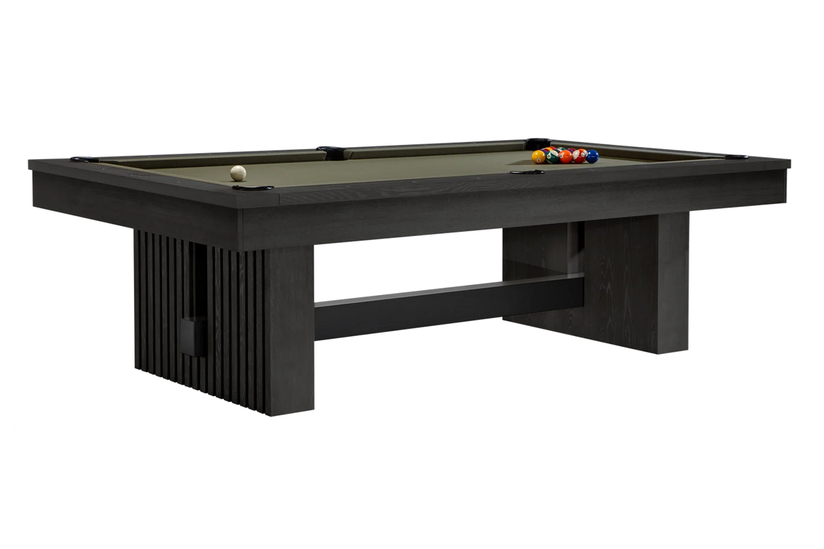 The Vancouver pool table features a modern mix of materials and textures highlighting its fresh and contemporary design. A wood batten-style base with a powder-coated metal beam completes the clean, organic aesthetic. Pair this billiard table with a dining conversion top for ultimate entertaining. This pool table features white pearlized diamond rail sights, robust construction, and internal drop pockets.