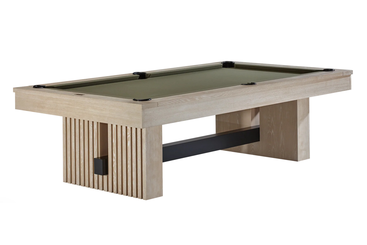 The Vancouver pool table features a modern mix of materials and textures highlighting its fresh and contemporary design. A wood batten-style base with a powder-coated metal beam completes the clean, organic aesthetic. Pair this billiard table with a dining conversion top for ultimate entertaining. This pool table features white pearlized diamond rail sights, robust construction, and internal drop pockets.